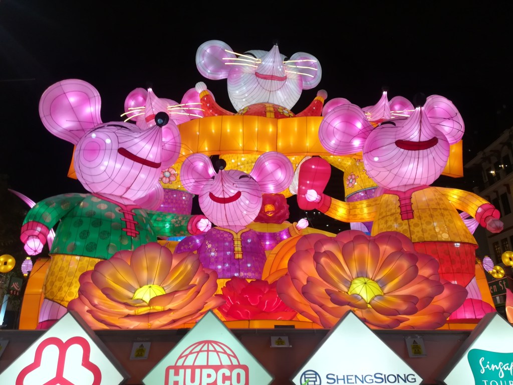 Primeira impressão: calor e humidade! Já não estava na Europa. Cheguei ao final da tarde e, depois de me instalar, fui jantar ao Maxwell Food Centre, um mercado com bancas de comida de rua, também conhecido localmente como hawker centre. Comi tofu e pau e estavam deliciosos! A comida foi uma das excelentes surpresas desta estadia em Singapura. Como fiquei instalada no bairro de Chinatown, ainda tive direito a apreciar as decorações alusivas ao Ano Novo Chinês.
