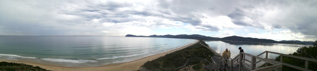 Depois, parámos no The Neck Lookout, sobre o estreito de terra que liga as regiões Norte e Sul da ilha. Que paisagem incrível! Se isto é lindo com nuvens, nem consigo imaginar como será com sol.