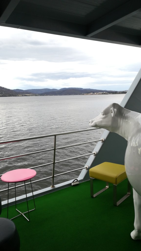 Depois, como o MONA está localizado 11 km a norte do centro da cidade, o próprio museu disponibiliza um serviço de ferry. Mais uma vez, esta viagem é uma experiência em si mesma. Os catamarãs têm zona VIP (mas eu fui para a zona dos pobres), um café com óptimo aspecto, paredes pintadas com graffiti e uma decoração peculiar – sentei-me no piso superior, nuns bancos em forma de ovelha! Mais ou menos confortáveis, mas seguramente originais.