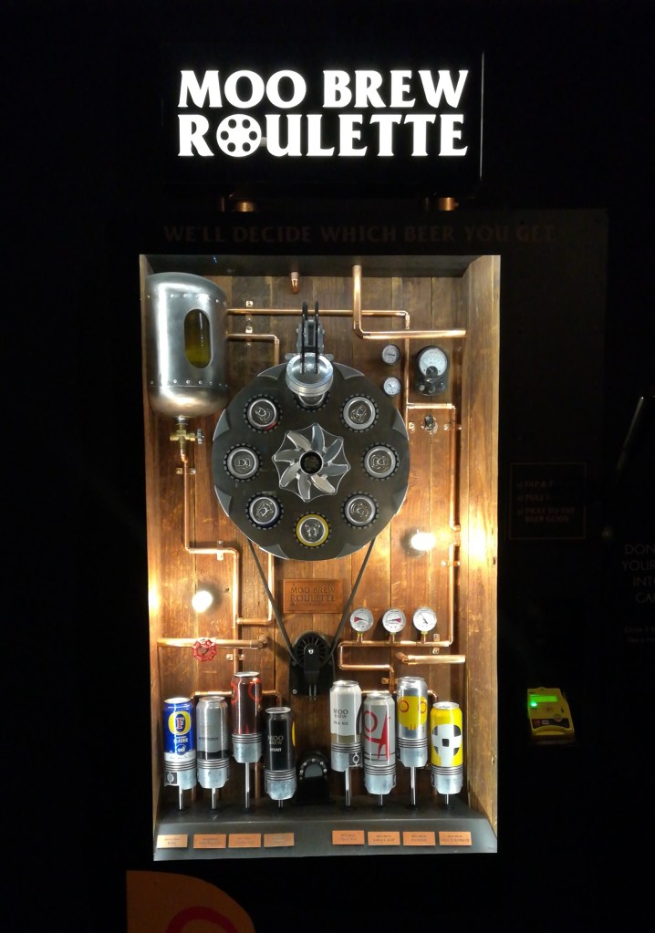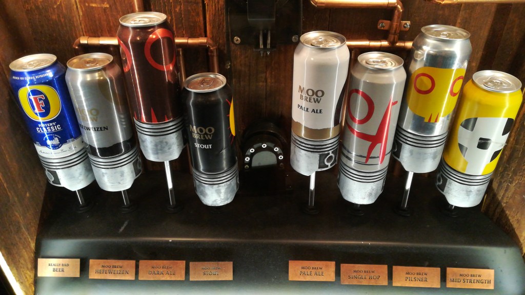A viagem de barco ao longo do rio Derwent é bonita e o MONA está muito bem integrado na paisagem. O átrio do museu é luminoso, mas a visita começa numa sala subterrânea a meia-luz, que tem um bar chiquíssimo. A primeira provocação, ainda no bar, é um misto de slot machine e máquina de vending. O jogador / comprador insere o dinheiro e terá acesso a uma cerveja. Mas não tem direito a escolher qual. Estão à venda sete tipos de cerveja da cervejaria do museu (*) e uma oitava cerveja corrente que está à temperatura ambiente!