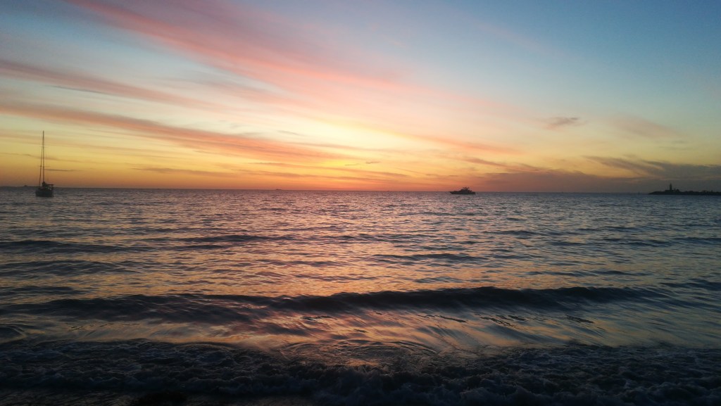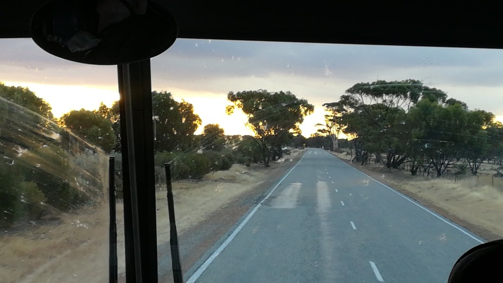 Visitada a onda, regressámos a Perth. Durante a viagem, assistimos ao pôr-do-sol sobre a terra semi-deserta.
