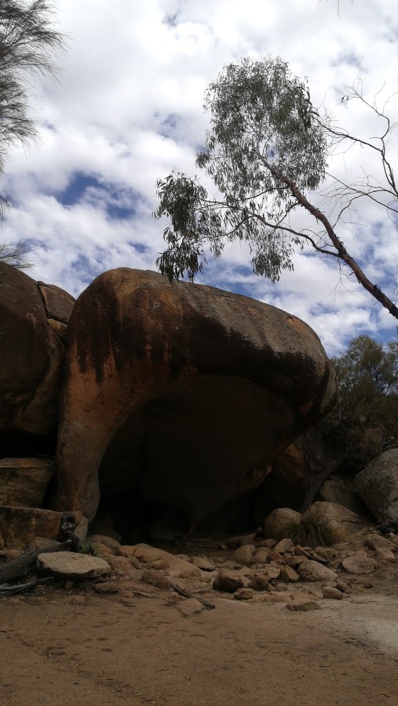 Depois deste pico de adrenalina, seguimos para Mulka’s Cave, uma gruta associada a uma lenda aborígene muito interessante. Reza esta lenda que dois aborígenes de tribos entre as quais não era suposto haver uniões ter-se-ão apaixonado e tido um filho, Mulka. Como era fruto de um amor proibido, Mulka nasceu estrábico e gigante e foi ostracizado e exilado numa gruta (a actual Mulka’s Cave). Mulka tornou-se canibal e comia as crianças que se aproximassem da sua gruta. A sua mãe censurou-o pelo seu comportamento e Mulka assassinou-a. Os aldeões perseguiram-no e mataram-no, tendo deixado o cadáver exposto, para servir de aviso a outros infractores.